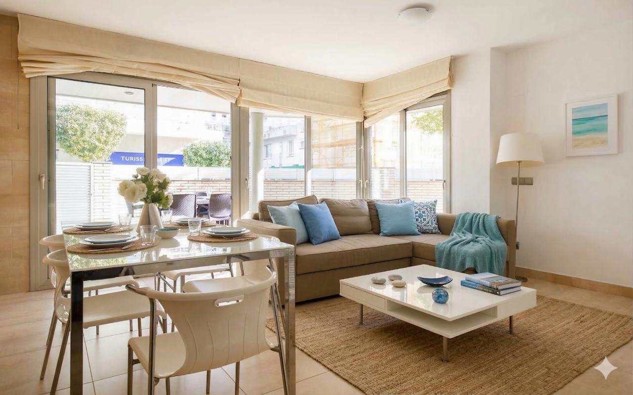 Disfruta de una estancia cómoda y moderna en este apartamento de diseño cuidado, ideal para familias o grupos de hasta 6 personas. ✔ Distribución: 2 dormitorios: Uno con cama de matrimonio y baño privado Otro con dos camas individuales Sofá cama doble en el salón (apertura fácil) 2 baños completos Cocina totalmente equipada con electrodomésticos de última generación Salón-comedor con acceso a terraza privada con mesa para exterior Aire a...
